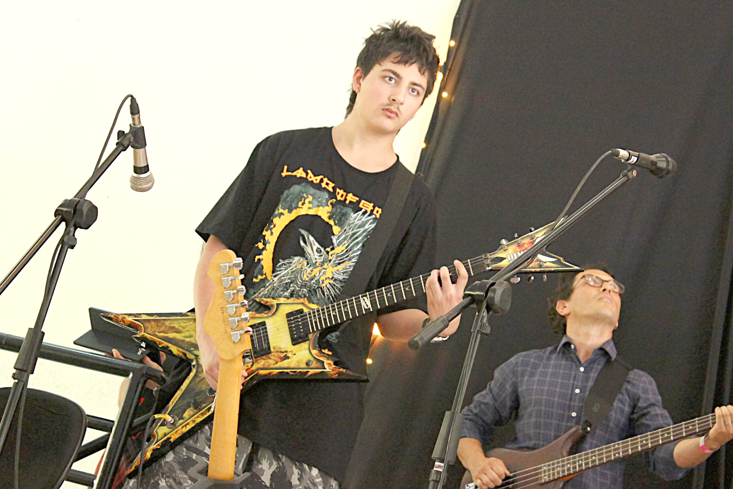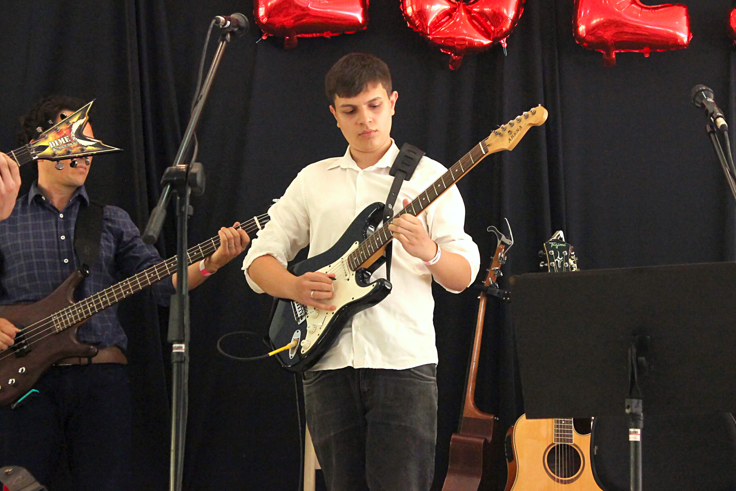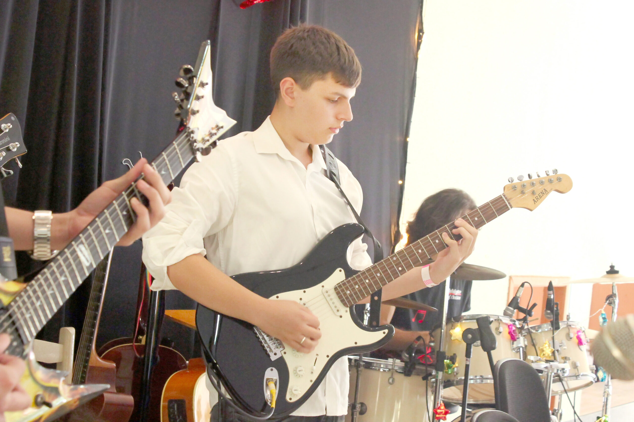 As aulas de guitarra são personalizadas conforme o nível do aluno. Trabalhamos técnica de palhetada, acordes, escalas, improvisação, leitura, timbre e aplicação prática em músicas reais.
